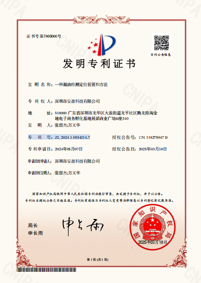 創新驅動發展,技術賦能安全。深圳市安盈科技有限公司此次斬獲發明專利,不僅為自身發展注入強大動力,也將對整個漏油檢測行業的技術進步和安全標準提升產生積極而深遠的影響。在未來,期待長安穩盈能夠繼續發揮技術創新優勢,為保障全球油品使用安全貢獻更多力量。